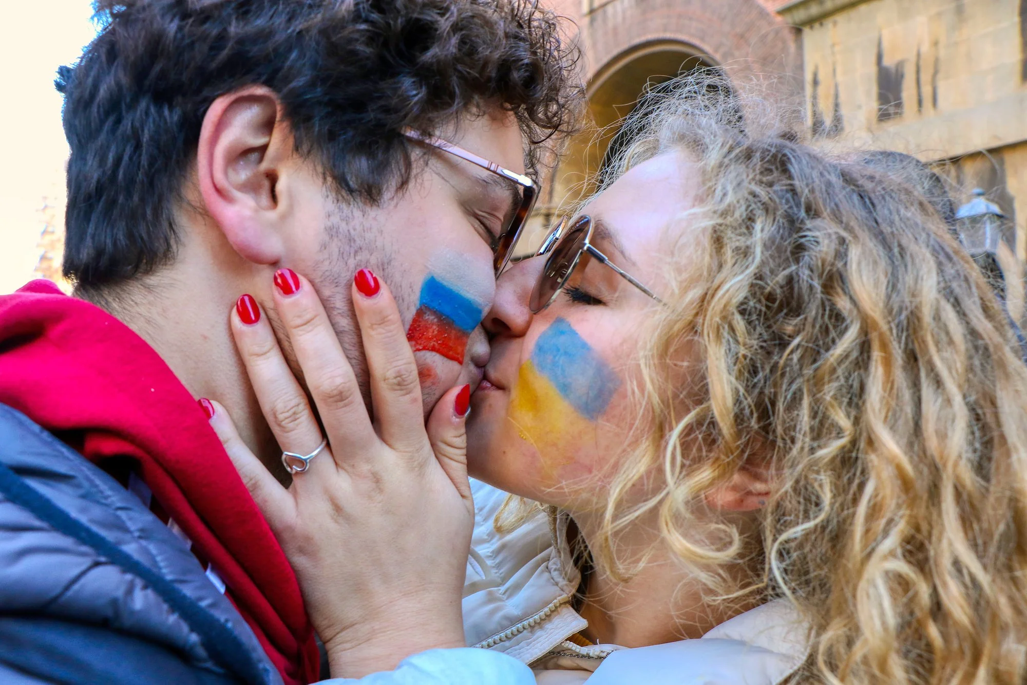 Couple kissing with Russian and Ukraine flags painted on cheeks. Demonstration against the war. Taranto, Puglia, Italy 26.02.2022 — Photo by Maxtod (Copyright © Depositphotos, 2022)